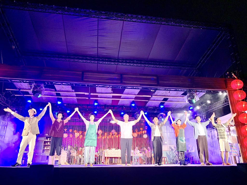 演出時,舞台上有阿燦師親自烹調的十多桌辦桌菜,除了當地來賓,還邀請幸運觀眾入席臨演,一邊看戲一邊吃辦桌。台下觀眾眼睛忙,嘴巴也沒閒,中場休息時現場發起油飯,事前宣導「鄉親哪,現場以歌舞戲為主,辦桌為輔,請甲飽再擱來!」但也大聲宣告帶著環保碗筷,結束後可以喝碗菜尾湯。秋夜微涼晚風輕拂,台上台下滿溢的是溫暖的人情味與嘴裡的古早味。