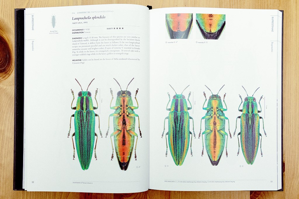 參考了捷克、日本等地圖鑑優劣、拿捏圖文比例,王惟正將吉丁蟲重要的相關資訊全部收錄其中,像是雌雄成對標本、寄主植物、產地,稀有度及身體特徵等,在內頁左上角也附有真實尺寸的昆蟲剪影,供人們比對,而負責用視覺說故事的部分,則交給馮議徹。