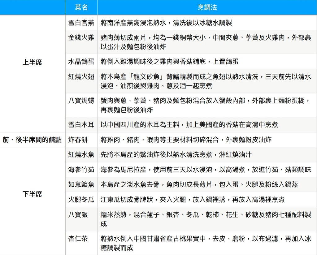 熟稔台灣飲食文化的師大台文系副教授陳玉箴,她在《「台灣菜」的文化史》中,考據了當時裕仁皇太子享用的菜單,「這些佳餚囊括燕窩、鴿蛋、火雞、魚翅、螃蟹、白木耳、鱉、海參等價昂食材,乍看與今日吃喜酒的菜色有些相似。」此一盛宴共分上、下半席12道菜,當年皇太子的烹調擔當,就是由台北著名的「江山樓」與「東薈芳」挑選。