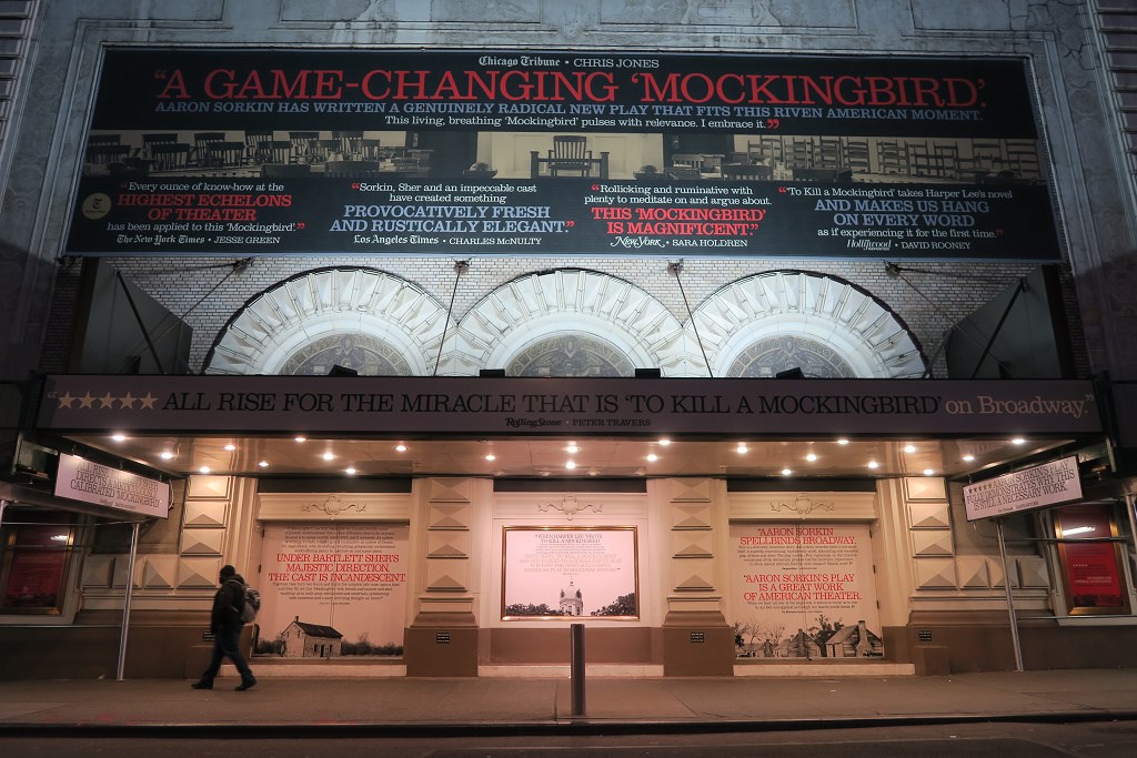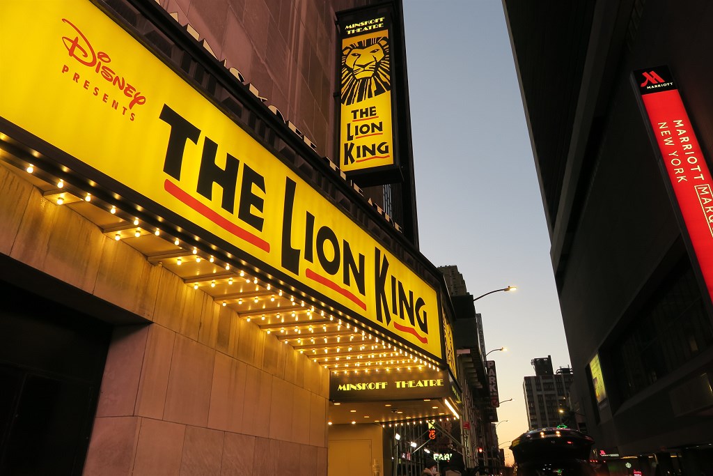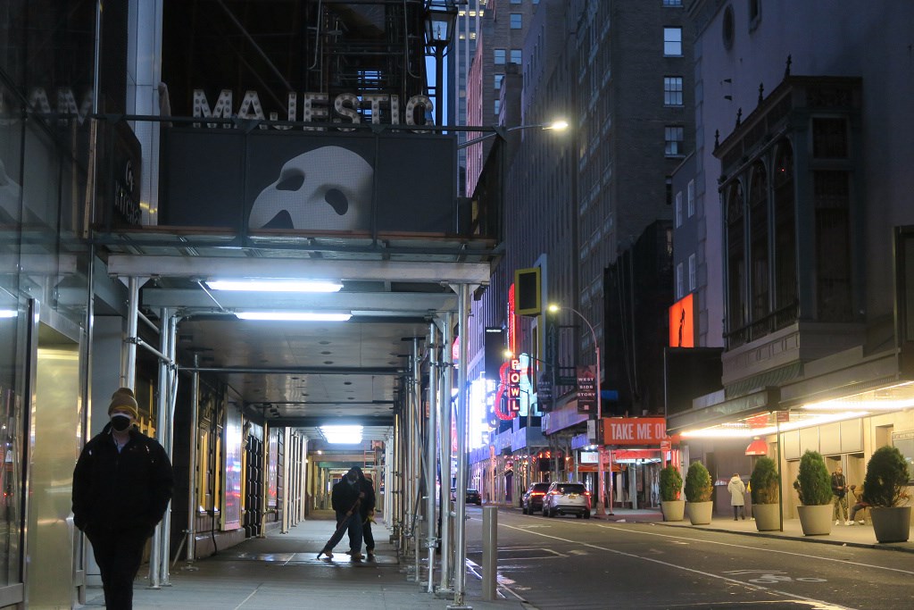 華燈初上,紐約時報廣場在五光十色的廣告看板襯托下分外璀璨,《獅子王》音樂劇的鮮黃色招牌依舊顯眼,但只有招牌還亮著,透明玻璃窗內漆黑一片。彎進西45街,明斯科夫劇場出入口只見欄杆,不見等待看劇的人潮。