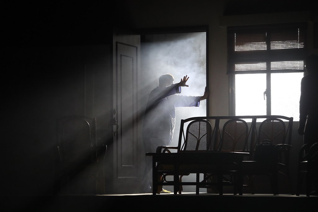 國家戲劇院的舞台上,演的是導演吳念真編導的人間條件6-未來的主人翁,劇情貼近當代日常生活,讓人看了心有戚戚焉,隨著劇情發展進入尾聲,一陣雷聲大作,窗外雷雨交加,主角推開門後透出一道強而有力的逆光,人影的輪廓在強烈光影襯托更顯清晰,透過觀景窗看到這一幕的我心揪了一下,趕緊按下快門,這就是攝影人心裡等的那一道光。