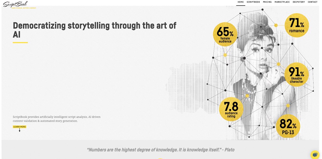 2015年成立的比利時人工智慧公司ScriptBook,專攻劇本分析。只要上傳劇本至ScriptBook系統,6分鐘內就能完成分析、獲得詳細數據,包含角色魅力量表、目標族群預測、觀眾滿意度指數等。ScriptBook也曾用演算法預測過去兩年上映電影的國際票房收益,準確率高達86%,相當驚人。