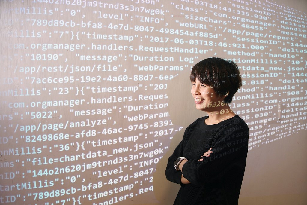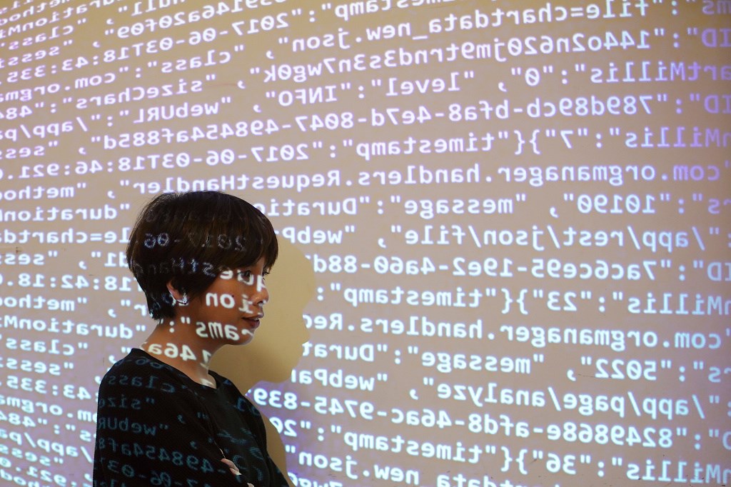 數據的科技藍海,投影在方夢貞工作室的白牆上,她站在牆前,程式語言交織在臉上。