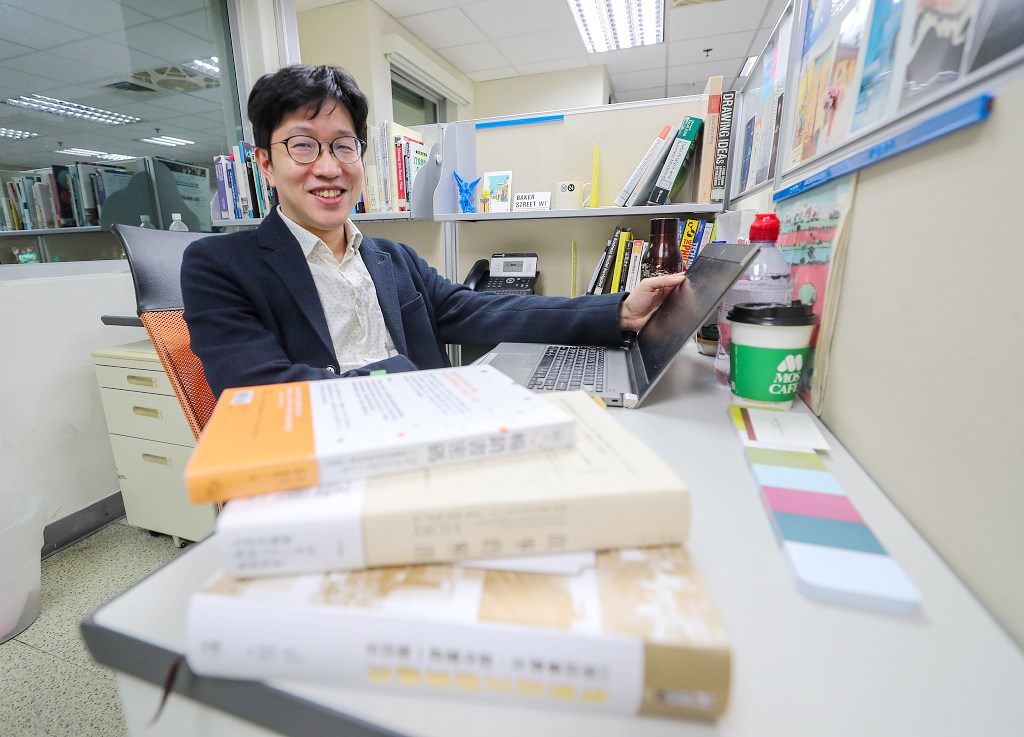 「全部都看完了,但沒有看很細啦!」徐毓良的辦公桌放滿密密麻麻的參考書,從創作經典《場景設定創意辭海》、《故事的解剖》、《暢銷書密碼》,到沒書皮、被拆成方便攜帶的無名書。