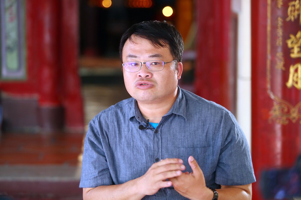 台南的4月初,酷暑難耐,坐著不動便熱汗蒸騰,洪瑩發滿面紅光,襯著身後的紅色廟門,猶如鑲嵌在門板上的人像。