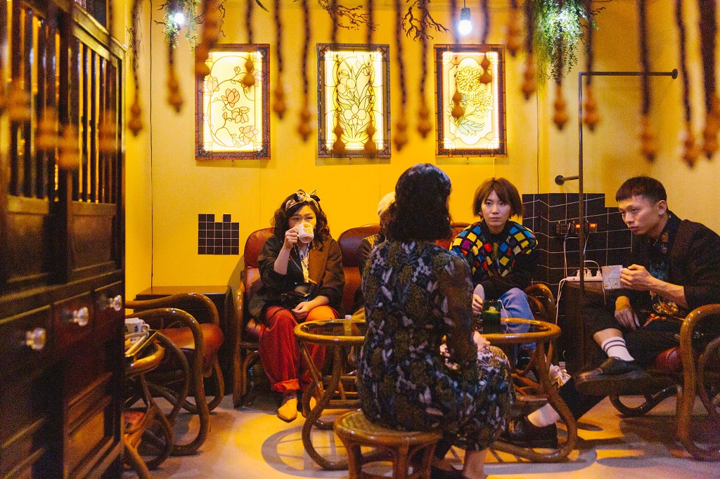 參加者們三三兩兩的聚成一團,有的嗑著桌上的小餅乾,配合時代氛圍,盒裡裝的是數字餅乾、卡哩卡哩,昏暗的燈光飄搖,為大廳增加點迷幻氣氛。幾位服務生站在角落,若開心,還能走過去調戲一下。飯店經理下一秒站上台,說什麼可留待其他時空穿越者細細品味,只先透露他將邀請大家舉杯共飲,讓氣氛更加熱絡。