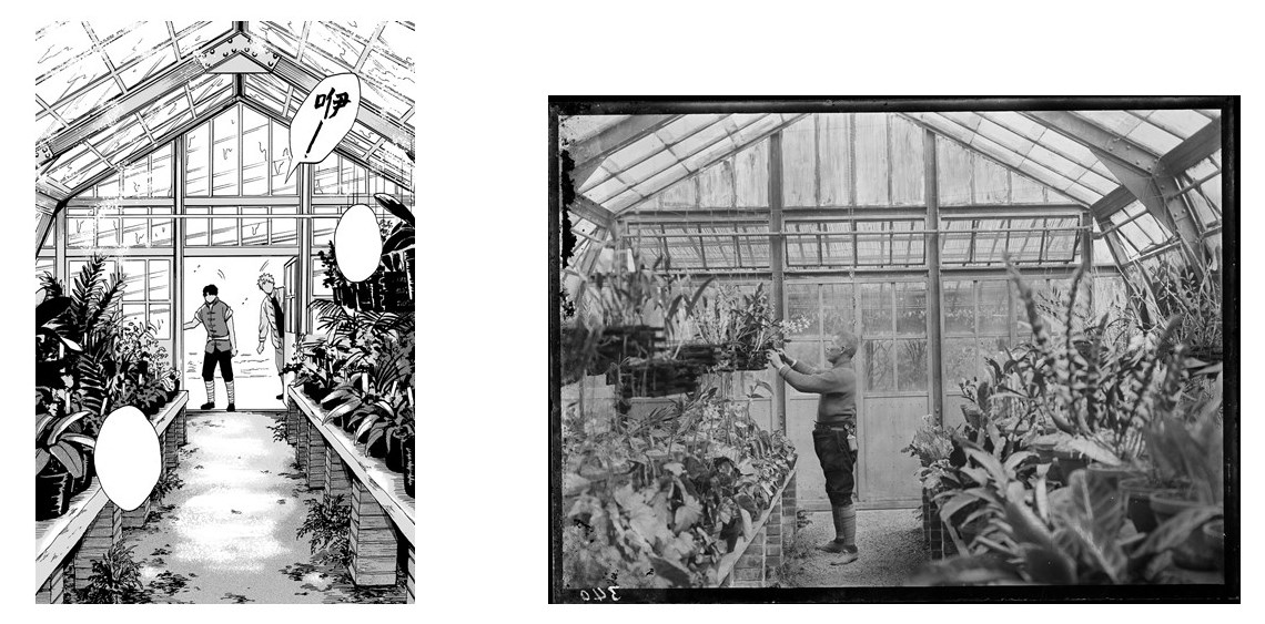 為了解決台灣過熱的問題,現代技術會透過風扇來為溫室降溫;日本時代則是透過水流,讓植物行蒸散作用,因此當時的溫室非常潮濕。而在漫畫家英張筆下,植物園的溫室水氣氤氳,地上有著水漬的痕跡,董景生稱讚:「讀者們可以看見,英張的漫畫還原時代的時候,是非常有溫度的。」