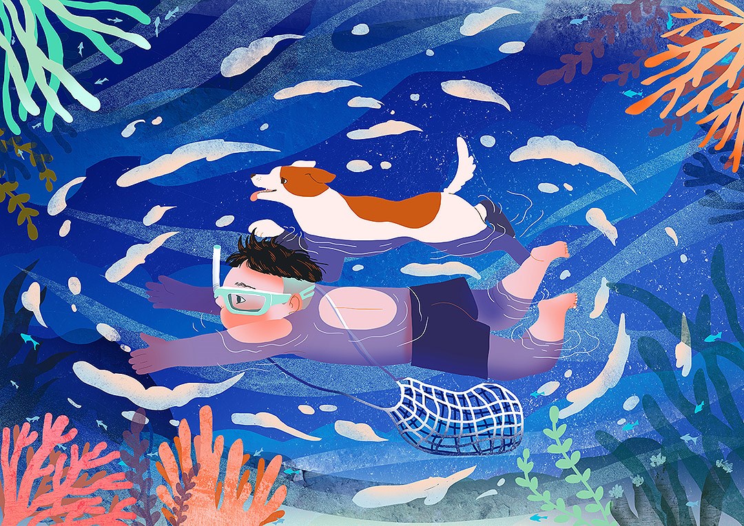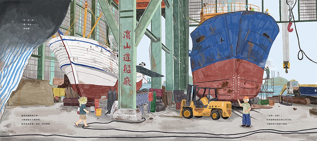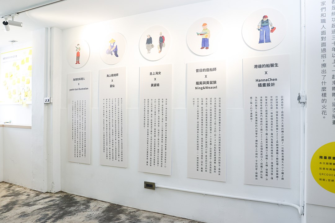 於是,藝術家夏仙以漁網師傅的孩子為視角,創作出漁網師傅工作的幕後祕辛與日常;Hanna Chen以漁船「吉濱七號」的視角,帶出修船廠師傅如醫生般的使命,帶出老船隻的歲月痕跡;羅寗與黃鼠狼 Ning&Weasel將阿林師傅對造船的回憶,在繪畫裡結合幻想,呈現職人對船的情懷。黃姿瑜以即將消失的海女文化為題材,創作記錄下這群靠山靠海維生的女性圖像;yunin tsai illustration以基隆正濱漁港,和平島當地特色食材帶入故事,用拼貼手法帶出生活感,呈現溫暖及在地風貌。