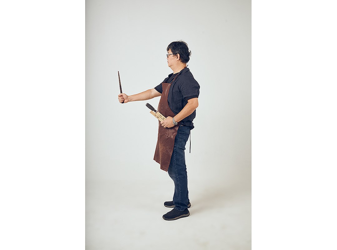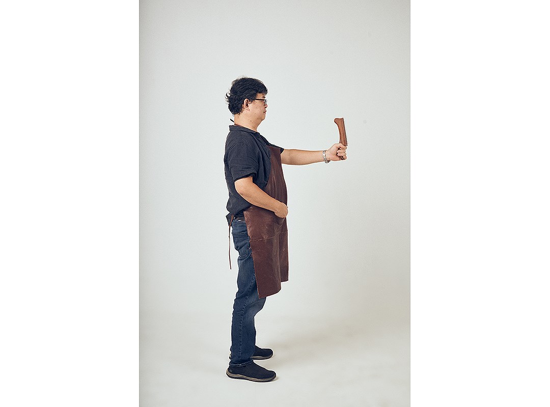 不像一般工作有幾種既定的工具,他說:「樂器維修所使用的工具,都要自己想辦法做。」由於所遇到的問題包羅萬象,想解決就得先想好策略,木頭究竟要切、敲、鑿、銼、刨、雕、刮……想達到什麼樣的線條,都得先做好對應。所以,要學會修,得先學會做工具。他認為,經過手工製作的樂器是有靈魂的,就像在黑板上用尺畫的線很直卻很死,而用手畫出來的,才有藝術的溫度。為此到現在,「磨刀」還是他每天工作前必備的儀式,就像是書法下筆前,靜心磨墨的功課。