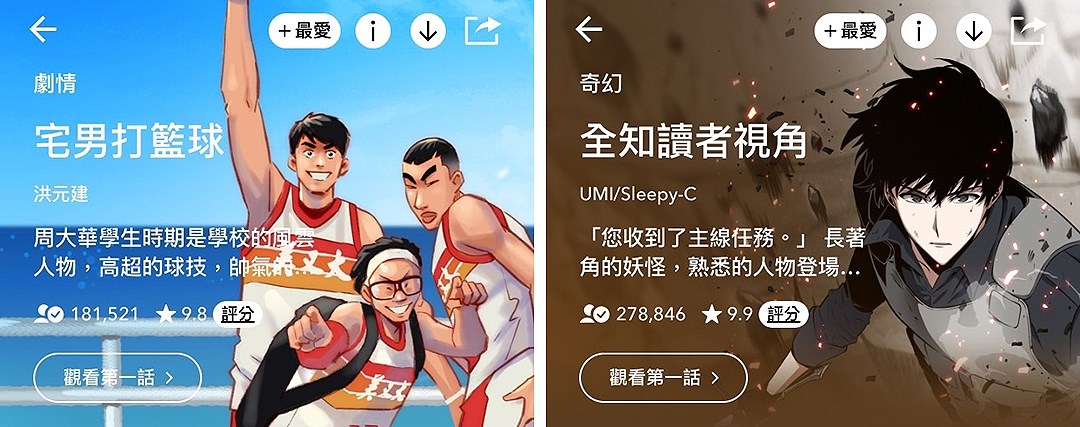 另一部我想推薦的是《全知讀者視角》,這也是韓國IP多元化很好的案例。它原本是韓國熱門小說,內容講述一位小說讀者突然穿越到小說中,而成為唯一一個知道這個世界會怎麼進行的人。擁有穿越、人性險惡,強劇情張力等元素的這部生存類作品,在Naver Webtoon上有9.7的評分,閱讀數也高達3.6億。這部作品今年也將在台灣推出,未來會有更多IP規畫。