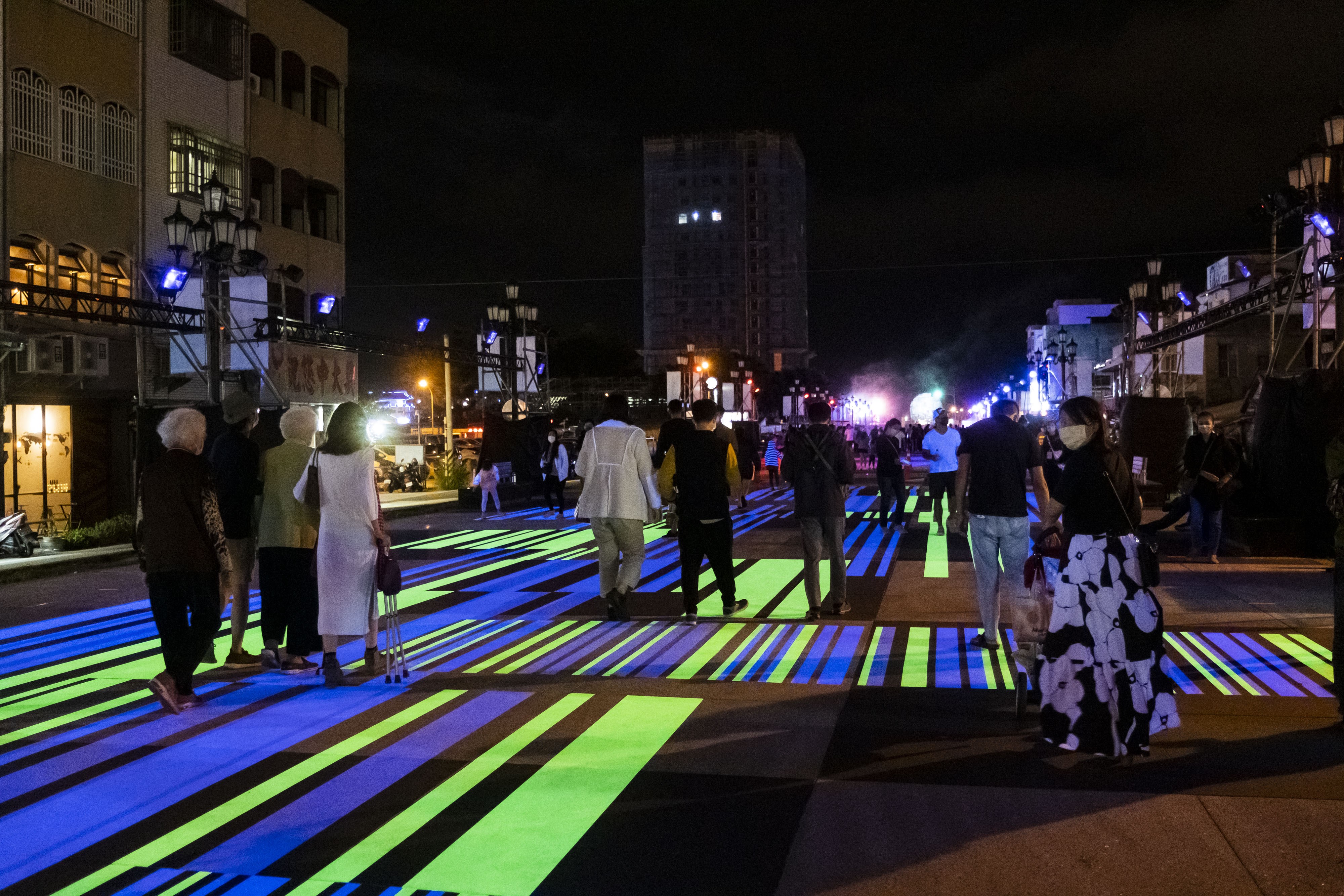 謝佑承與王中原以螢光膠帶製作地景圖樣的《校準:路徑》夜晚發光,彷彿大道就暫時消失在斑斕螢光之中,一直到失序場與在地滑板團隊共同呈現的《非常動態運動-失序邊境 選段演出》;最後走到豪華朗機工募集回收鏡子所創造的《鏡岕》。