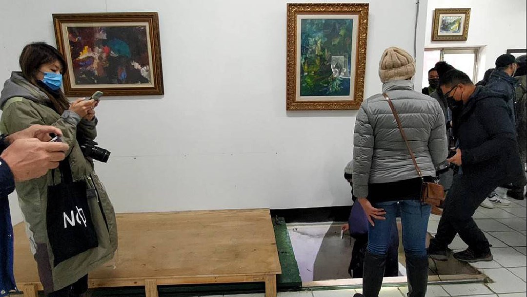 畫室擺設很簡潔,素白的牆,等距懸掛幾張畫,有水彩,有油畫,有人畫濤濤海浪,有人畫的很抽象。大片方格線條的白色磁磚地板,有塊綠色鐵板突兀的鑲嵌在角落,推開鐵板,眼前竟然出現昏暗的地下坑道入口,簡直恐怖電影情節。