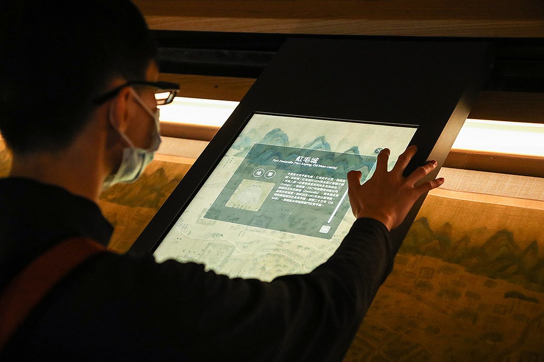主題照:《康熙台灣輿圖》是國立台灣博物館鎮館之寶,台博館研究組助理研究員吳佰祿領採訪團隊走訪台博館三樓觀賞複製圖,古地圖透過數位展示,讓人更能一窺堂奧。(攝影:王騰毅)