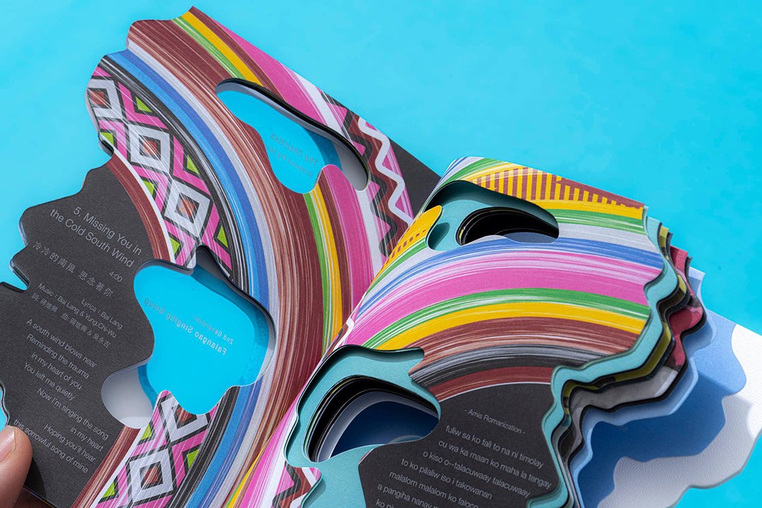 不過李政瀚補充,這也反應個人平時對生活的感受力、觀察力,例如《八歌浪》外包裝用藍色的塑膠片營造海洋氛圍,就來自某天滑網站Pinterest看到的藍色液態透明桌椅,再融合先前田調的族人、土地、海洋,與自己前陣子迷上的立體書。