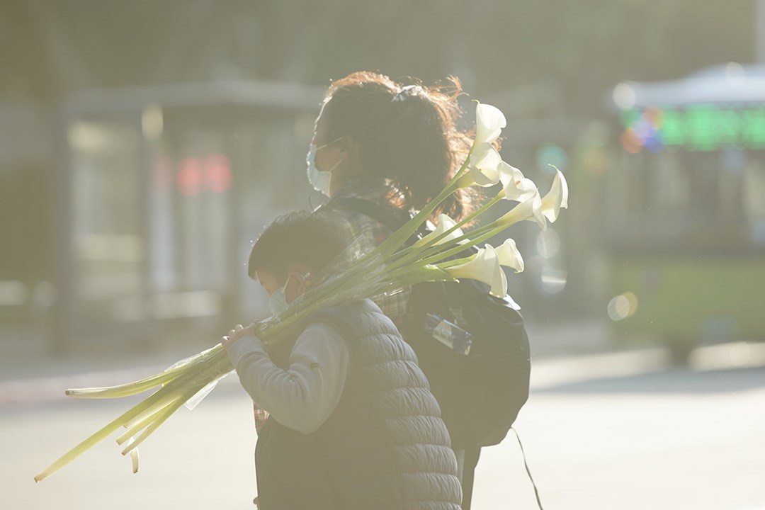 一個落日餘暉的北市街頭,停等紅燈之際,那道刺眼的逆光,並沒有讓我閉起眼睛,只因一個男童肩上的海芋,在夕陽的照耀下,晶瑩剔透著實吸引了我,剛好胸前掛著相機,顧不得剩下幾秒的紅燈,趕緊開機按下了快門。或許是揮別連日陰雨,心情有些暖暖的。