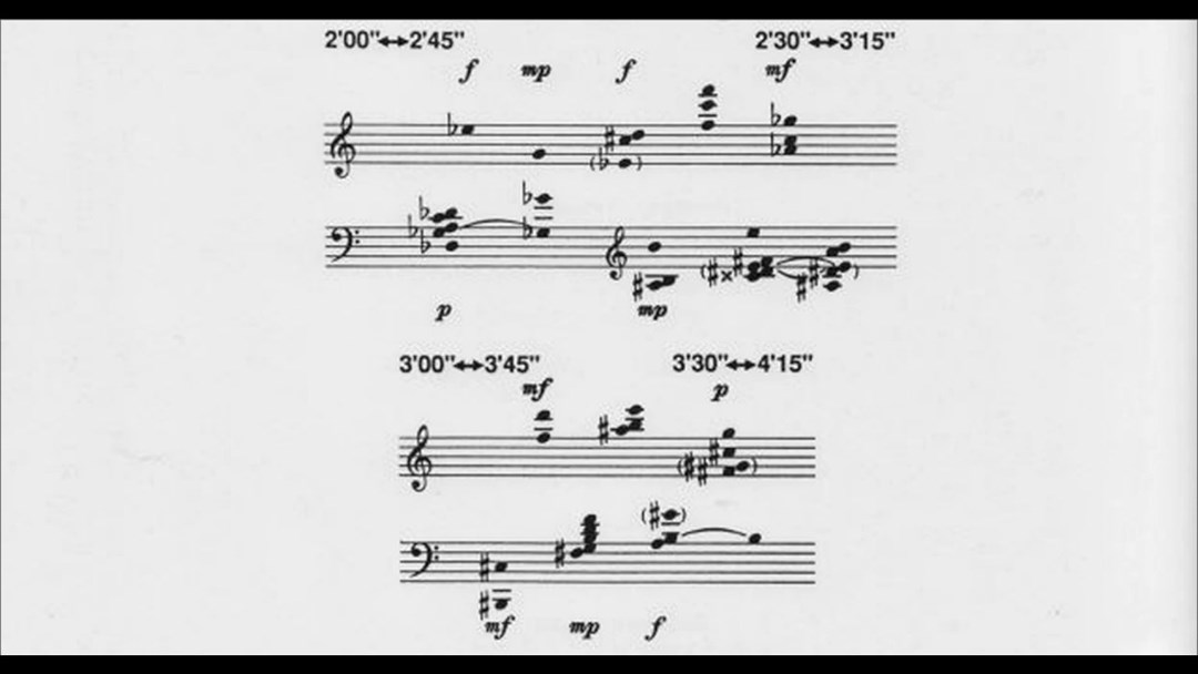 另一個令人印象深刻的例子,就是美國作曲家約翰.凱吉(John Cage)的《One》,讓演奏家從2分到2分45秒演奏第一組的和弦,2分30秒到3分15秒演奏第二組……每組都有不同的時間規範。在兩組中間有交越之處,讓演奏家在當下操作,如此的做法皆有其意圖,並非隨意設定。