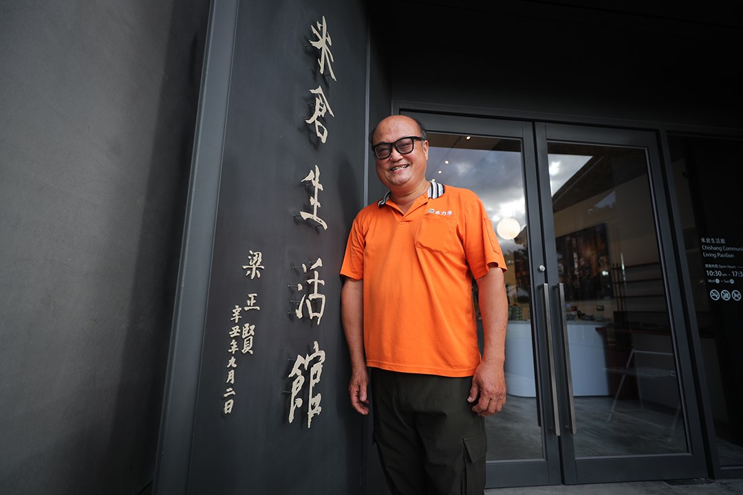 採訪梁正賢那天,他人未到聲先到,宏亮的嗓音和友人討論池上的大坡池可以「再怎麼弄」,讓人更舒適。不過聲音搶先見客,張望大門門口後卻無人影,他一抹橘色的身影這才從米倉生活館後門竄出,熱絡的向我們打招呼。