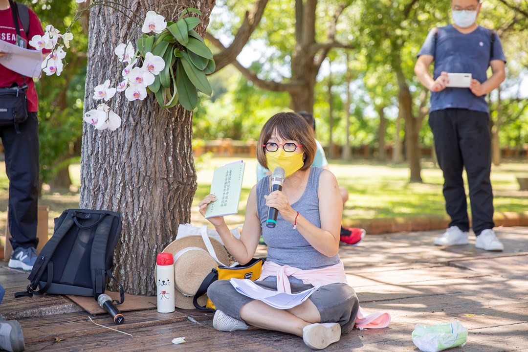 來到古蹟建築豐富密集的新埔鎮,也是詩人杜潘芳格的故鄉,大家因文學齊聚在褒忠亭義民廟廟埕上,講師張芳慈帶領大家理解杜潘芳格〈平安戲〉與〈中元節〉背後的政治性,及時代更迭下所造成的無奈、壓抑與苦痛。