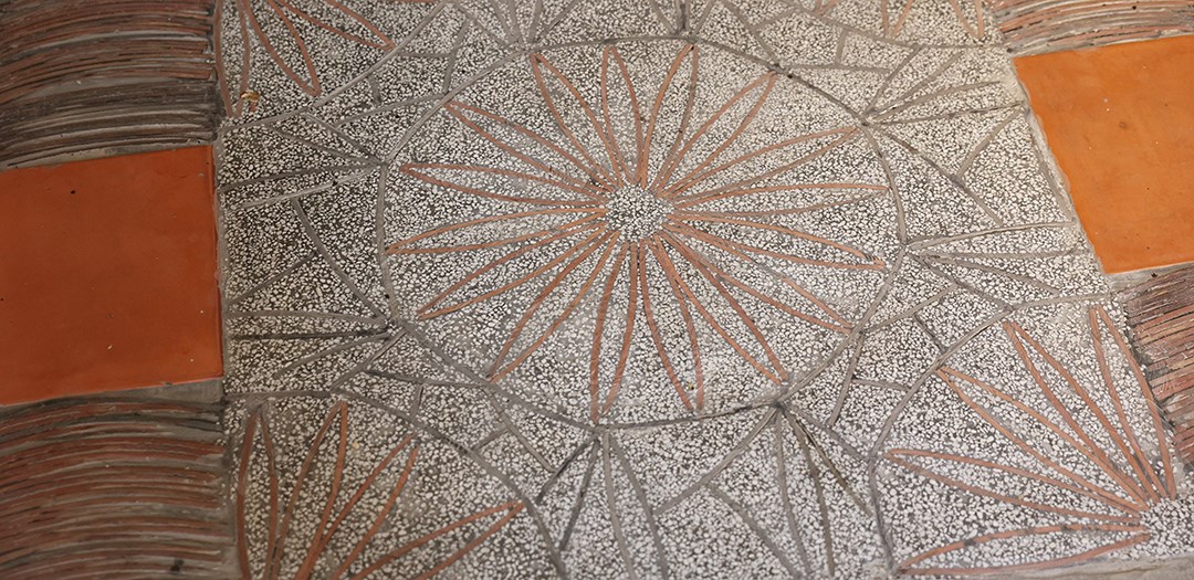 古正君指著前廳嵌在地板上的瓦片解釋:「南風天,地板容易反潮,但鋪上舊瓦片卻能將地底溼氣更有效率的發散,地板會呼吸,如果全部都用水泥將地板全用水泥封起來,就容易反潮。後來整修二、三進時也比照辦理,附近有些修老宅的朋友覺得這個點子不錯,也跟著採用這樣的方法。」