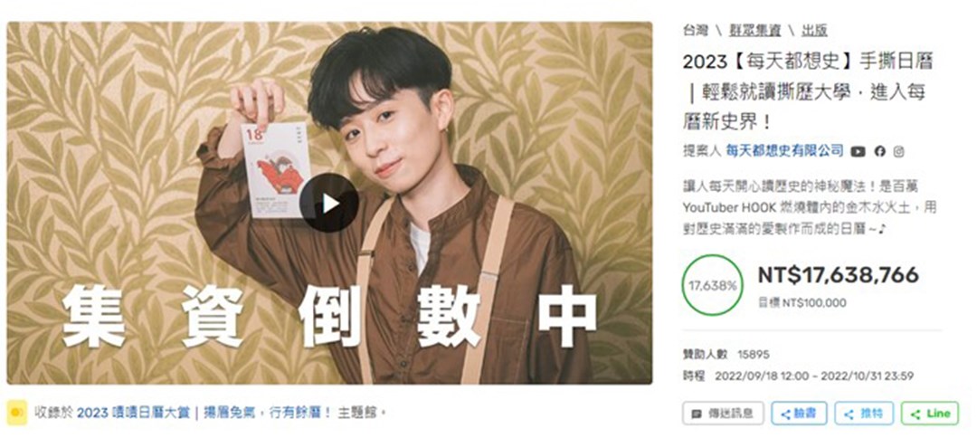 林大涵指出,突破千萬是日曆於募資平台掀起風潮很大的關鍵,「日曆不到1000元,算中低單價產品,這樣的紙質出版品可以做到千萬規模,讓許多出版人認為這是可以做的事情。」