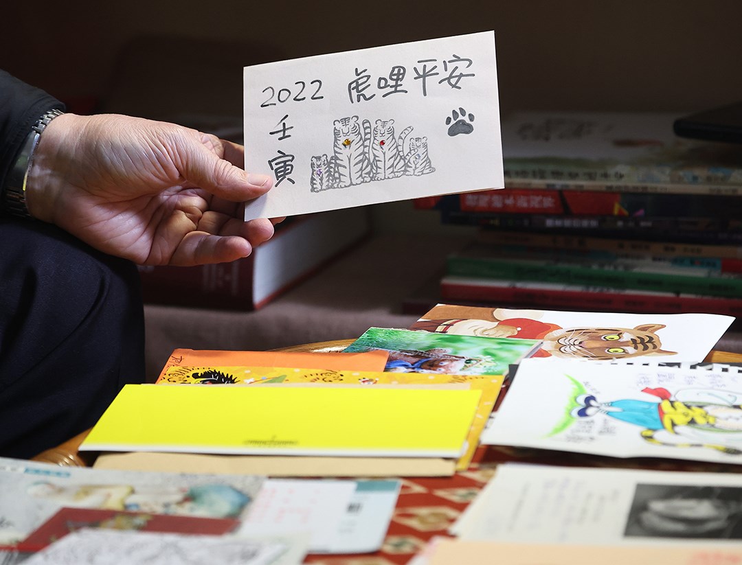 雖然數量繁多,但不同卡片的造型、材質、特色、內容、寄信人,曹俊彥無不如數家珍。例如以虎年收到的卡片為例,有人以色紙摺了可以站立的老虎,有人用漆畫創造出色彩斑斕的老虎家族,有人則取「虎」的台語諧音,祝福他「虎哩平安」。