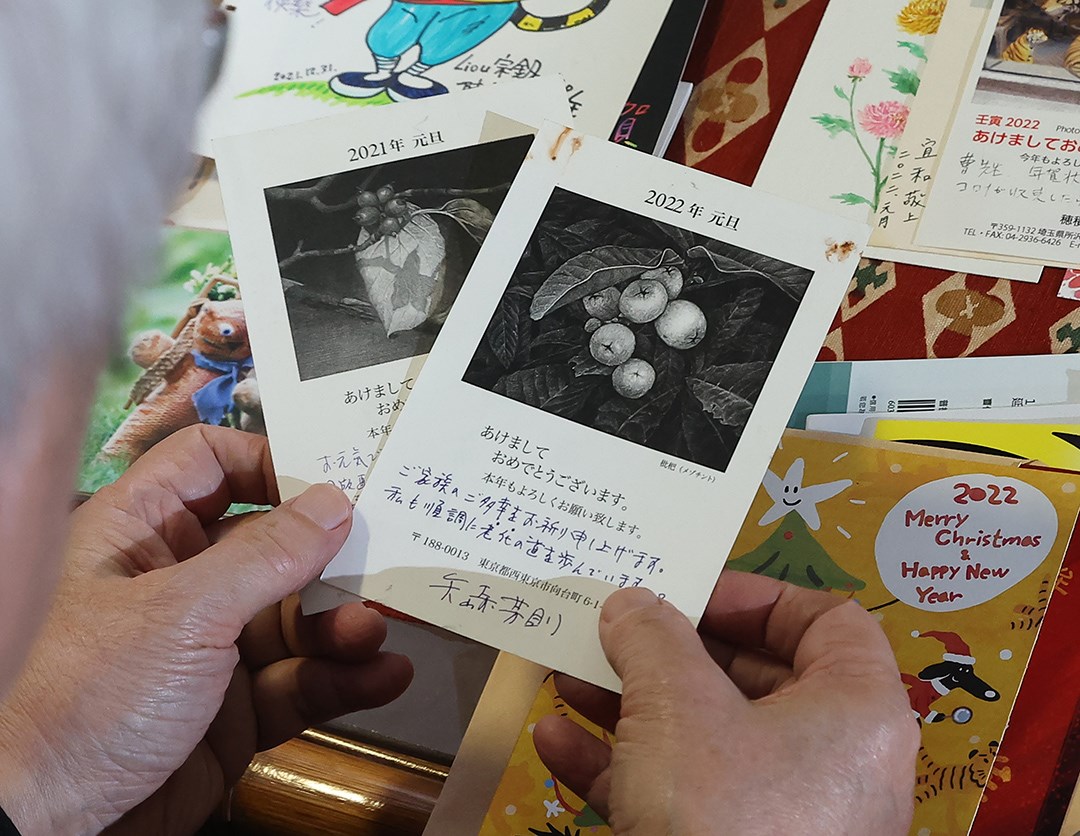 曹俊彥揀起一張有枇杷圖樣而寫有日文的卡片,他說,那是與他非常要好的日本畫家矢崎芳則所畫的,「這是他自己做的銅版畫,用針去刻的,刻完再印刷出來成卡片,妳看看他這個版畫的紋理跟光影都處理得非常好。」