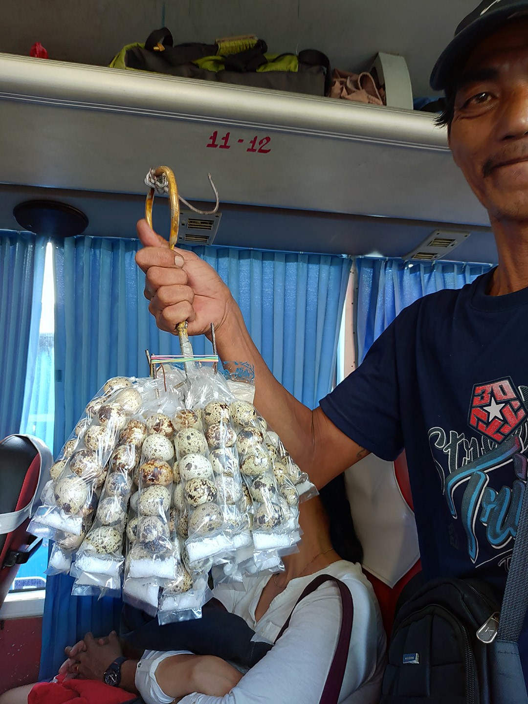 長程巴士接送乘客途中,每到定點就有小販跳上車,兜售鵪鶉蛋、花生、suman malagkit(椰奶甜粽)、bibingka(椰奶糕)等菲律賓零食。等乘客買上一輪,巴士也開了老遠,小販才跳下車。走走停停下,花了10小時才抵達馬尼拉。