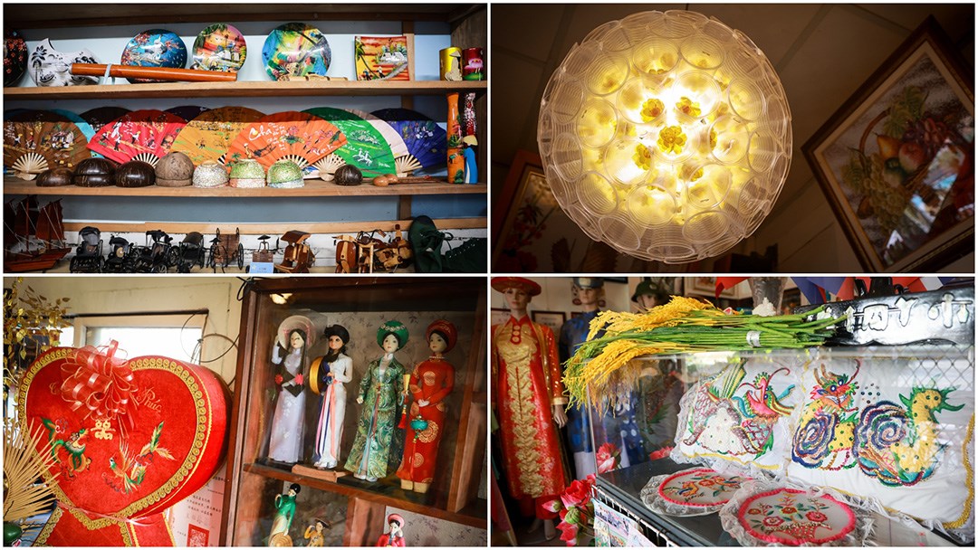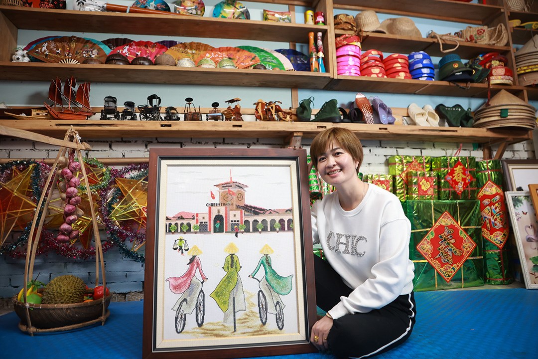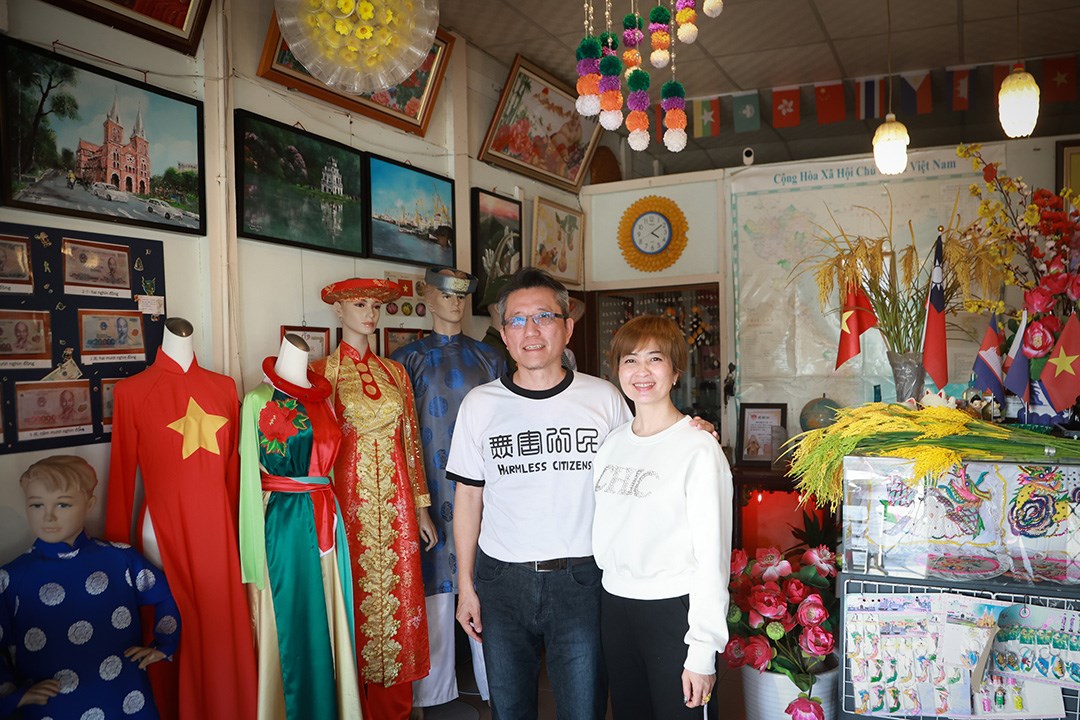 蔡崇隆自豪指著牆面的表演道具說:「這些都是她做的,她手很巧啦!」阮金紅拿下一幅十字繡,是3個女性穿著「奧黛」、戴著越式斗笠、騎著自行車的背影、背景則是越南首都胡志民市政府,她說,這幅十字繡是最喜歡的作品,充滿越南味。