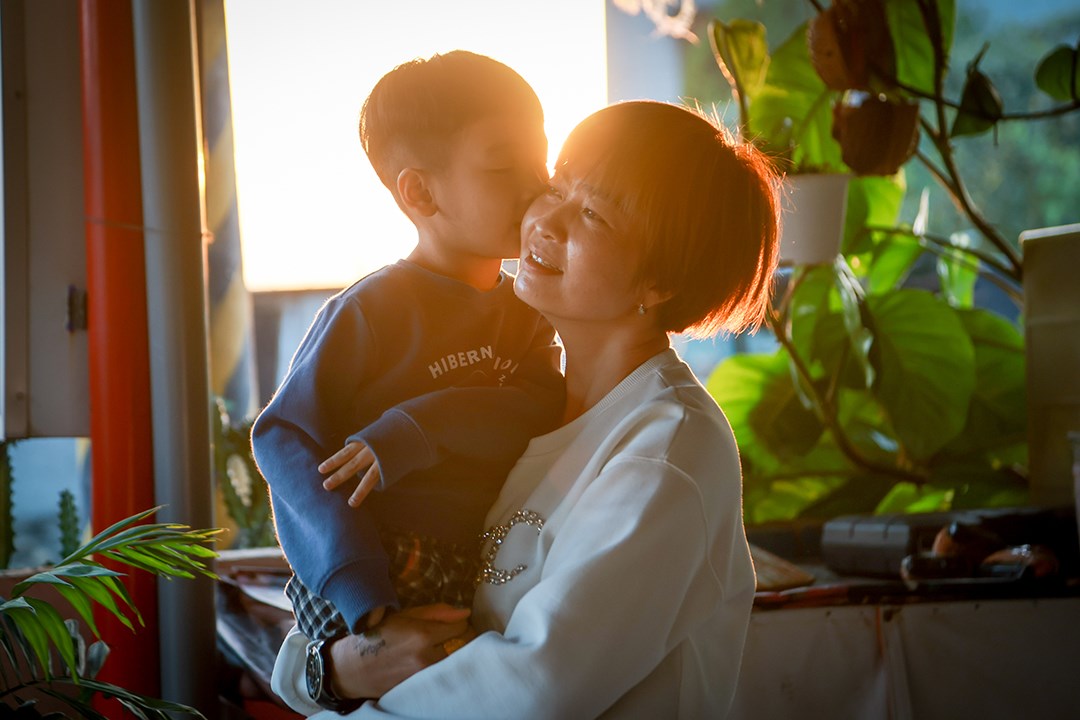 太陽斜斜地照在抱著小男孩的阮金紅身上,她熱情的要小男孩親一口,小朋友也害羞地嘟起嘴。