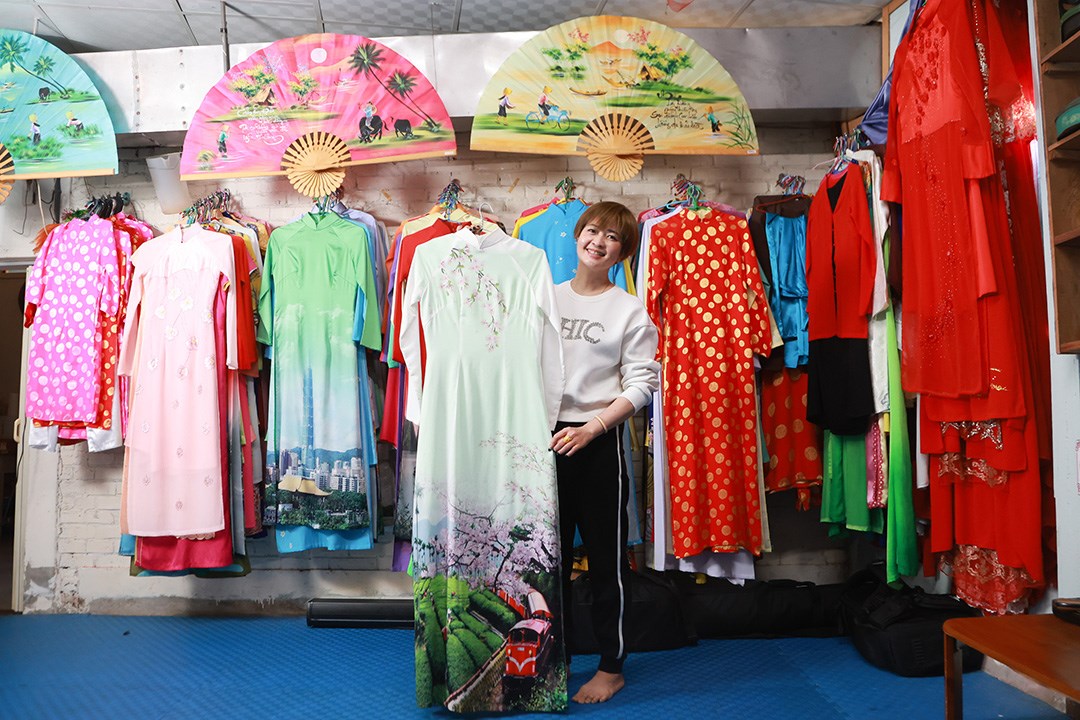 另一面掛滿「奧黛」的牆上,阮金紅則拿出多件「限定版」展示,從台北101、阿里山小火車到高雄龍虎塔,還有台灣獼猴、客家花布色,精緻圖樣印在奧黛的裙擺,都是她親自選出的台灣知名地景,不禁讓人看了會心一笑。她又拿出印上越南與台灣地圖的樣式介紹,更是希望拉近台越關係。
