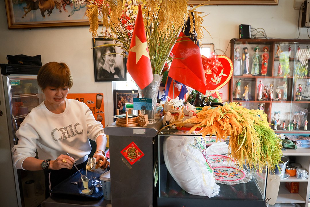 阮金紅熟練地穿梭在「越在嘉文化棧」,從廚房拿出一大袋冰塊,敲碎之後再放進玻璃杯中,「要加多少煉乳?都可以自己加喔!」