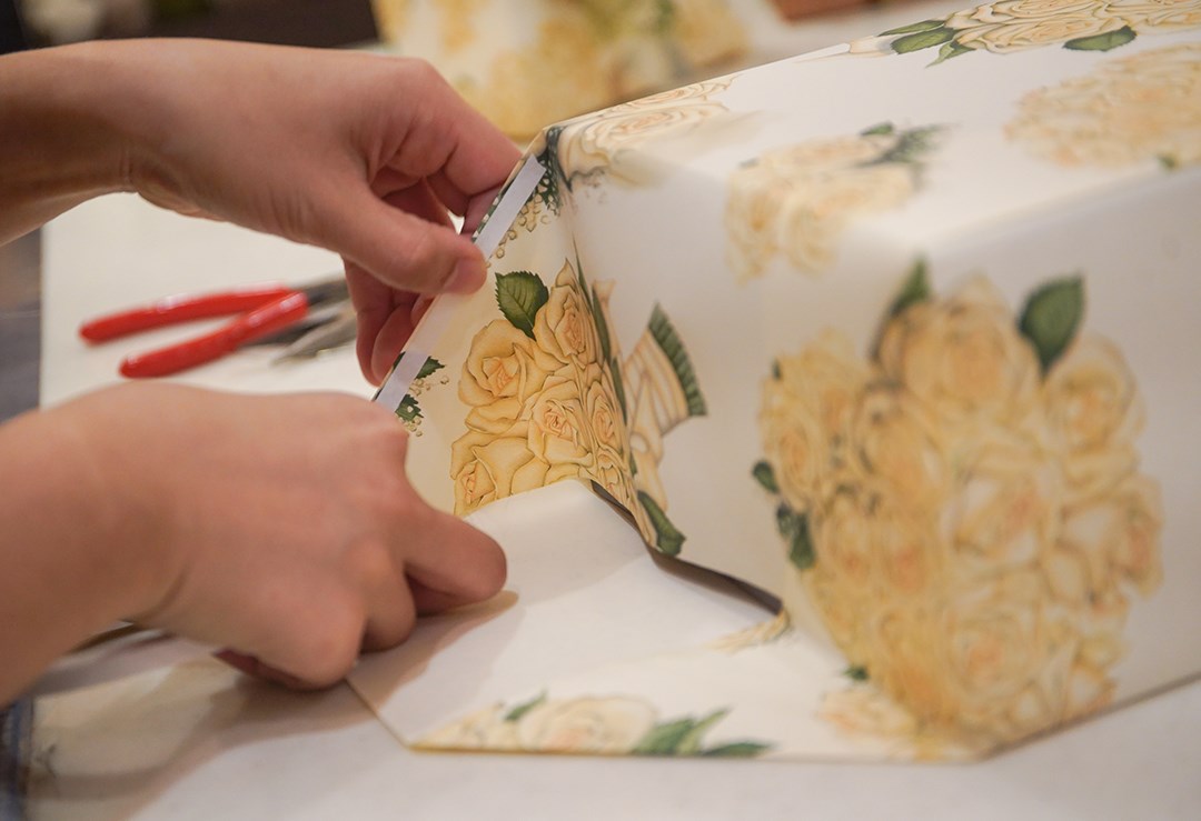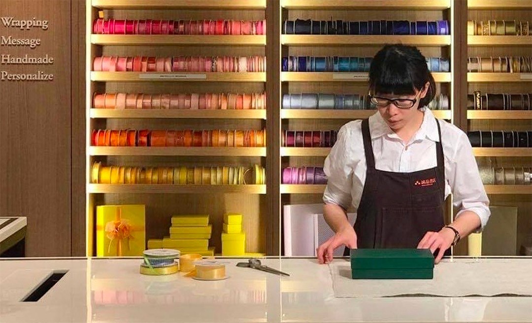 俐落交替使用著剪刀、雙面膠、美工刀,服務逾4年的包裝區組長怡安,受訪時順手替母親節檔期的禮品搭配合適的材質。從裹上包裝紙到最後的緞帶花步驟,平均只要10到15分鐘,即可完成,怡安笑說每回最耗時的,是陪著客人討論出理想外觀的過程。