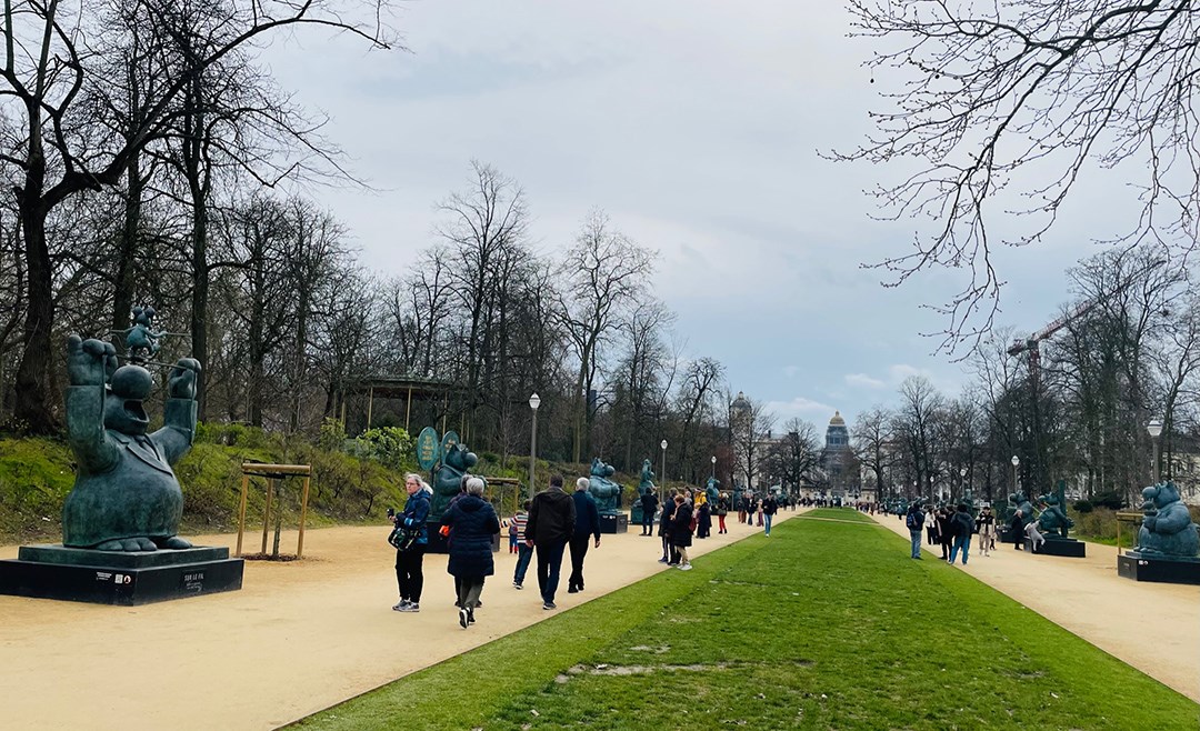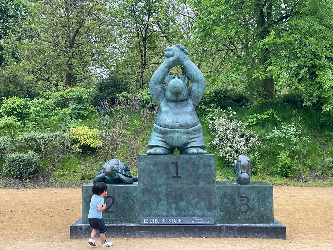 布魯塞爾的春天陰晴不定,記者幾次路過布魯塞爾公園展場向喵皇塑像朝聖,總能看見老老小小圍繞著「這貓」而笑。例如一尊它高踞頒獎台冠軍位置,兩旁的第2、3名分別是烏龜和蝸牛(↓見圖),無須任何文字說明的趣味穿越年齡、文化、語言隔閡。