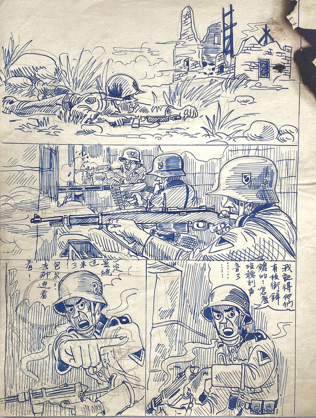 那是張帶揉皺折痕的紙,經過數位掃描,藍色原子筆線條外,還可以看見淡而清晰的鉛筆打底痕跡,在楊德昌勾勒出小小的4格方框中,有斷壁殘垣,有沉默開槍的士兵,傳達軍人戰地埋伏的緊迫氛圍。