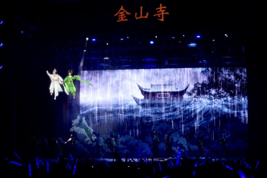 同樣在8月,暌違11年的明華園總團《超炫白蛇傳》在嘉義縣政府前演出,現場超過5萬名觀眾穿起雨衣,滿心期待,就是等待「水漫金山寺」段落白蛇青蛇騰空踏浪的英姿,6輛消防水車水槍來回噴發製造效果,被水浪噴到的民眾尖叫聲加上歡笑聲,宛如是明華園專屬的沉浸式劇場,開心指數不亞於坐雲霄飛車。