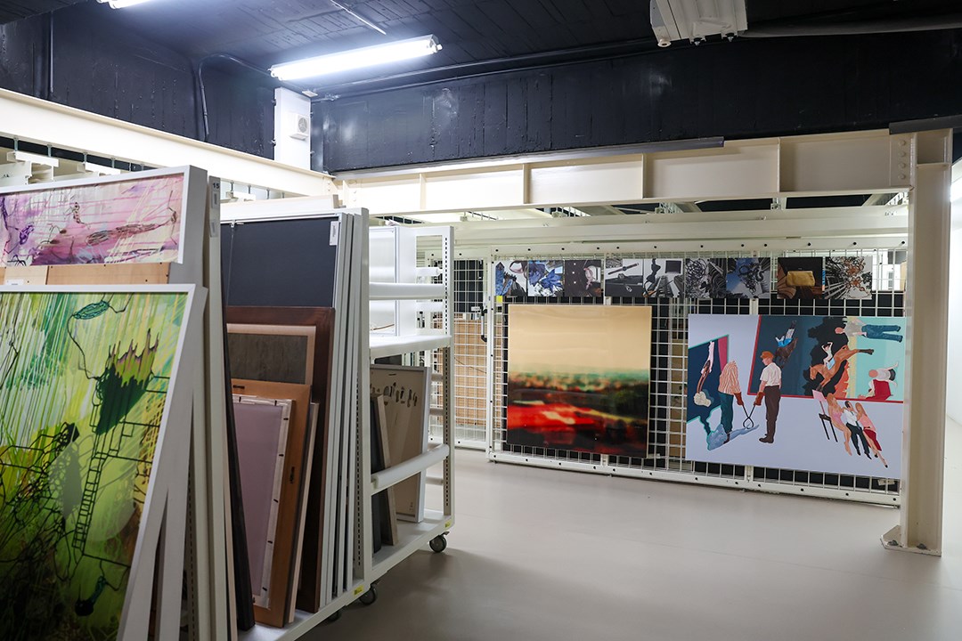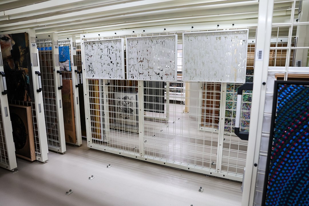 跟著陳松志走到藝術銀行平面類庫房,各色作品鑲在裱框、懸掛在滑軌網架中,風格迥異而或濃或淺的色彩,排排列看來竟有在看跑馬燈的錯覺,每幅裱框都標誌著創作者們的某個時刻與思想。