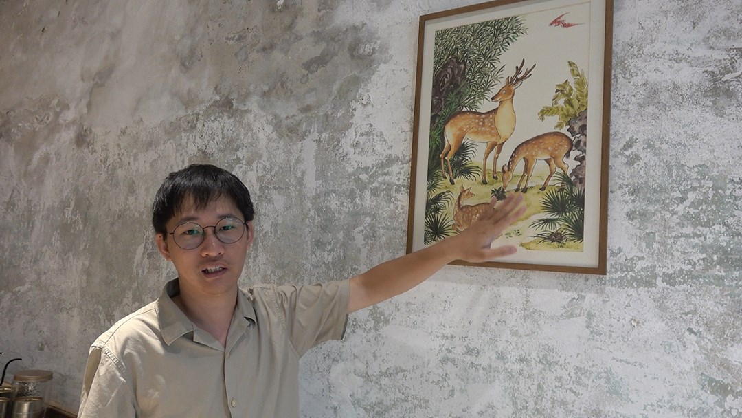 茶館的牆上則有著一幅柯舜耀請鹿港畫師繪畫的台灣梅花鹿,象徵台灣原生種動物,要向顧客介紹台灣生態,有趣的是,畫裡還藏著吉祥的寓意,畫的角落有著蝙蝠和靈芝,分別象徵福和壽,與梅花鹿象徵的祿合在一起,就有了福祿壽之意。