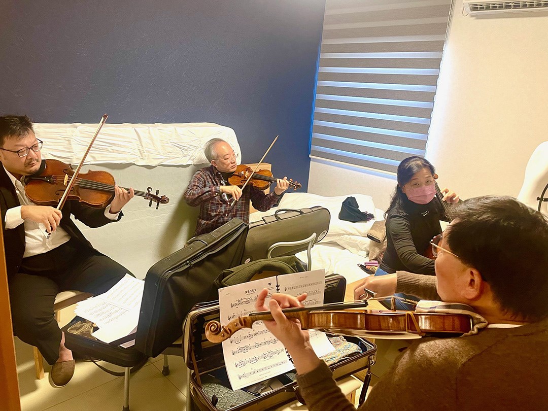 那房間說大也不大,大家合力把雙人床立起來,靠在牆邊;桌椅推到角落,勉強空出了空間,四人架起譜架,打開琴盒,靠緊緊彩排,四人演奏時的細節叮嚀沒有少,沒有人有怨言。