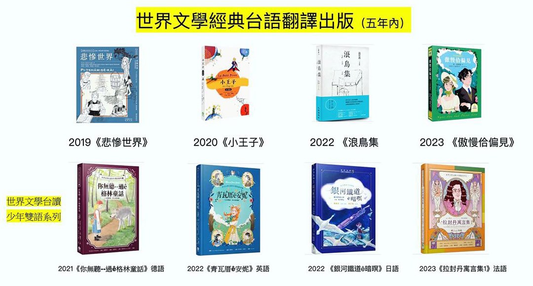 鄭順聰細數自2020年以來的台文版經典文學名著,包括《小王子》、《浪鳥集》、《傲慢佮偏見》、《你無聽過ê格林童話》、《青瓦厝ê安妮》、《銀河鐵道ê暗暝》、《拉封丹寓言誰1》,;這個月(2024年6月)又有《羅生門》、《都柏林人》。加上2019年《悲慘世界》,這5年來就有10本以台語文翻譯世界文學經典的作品問市。