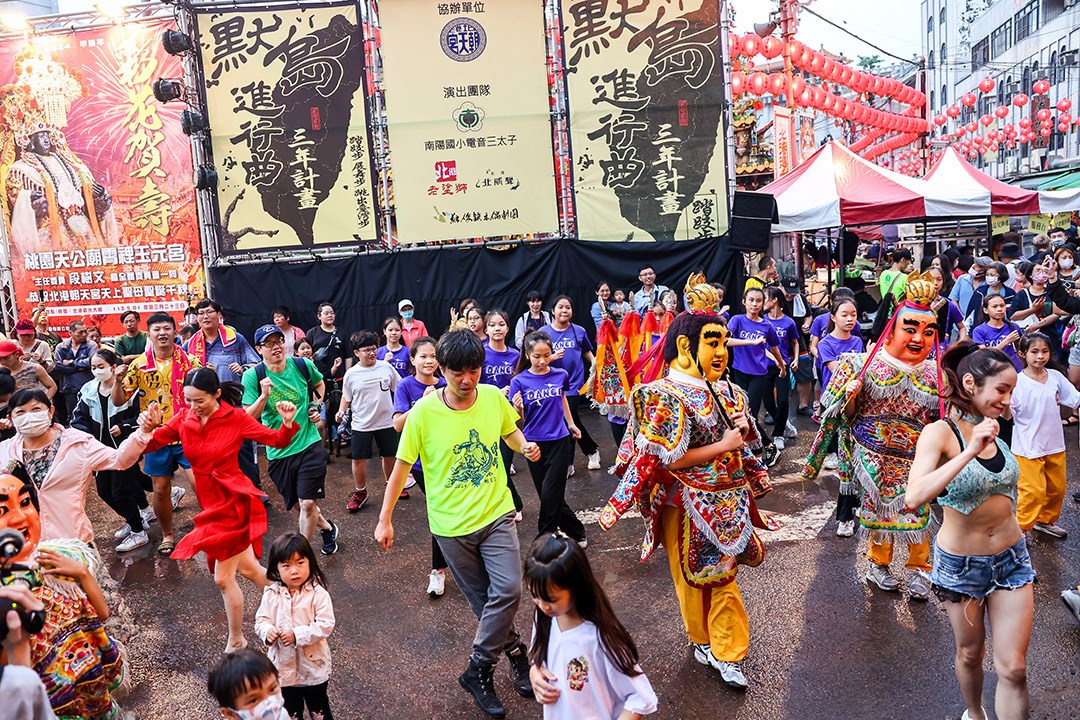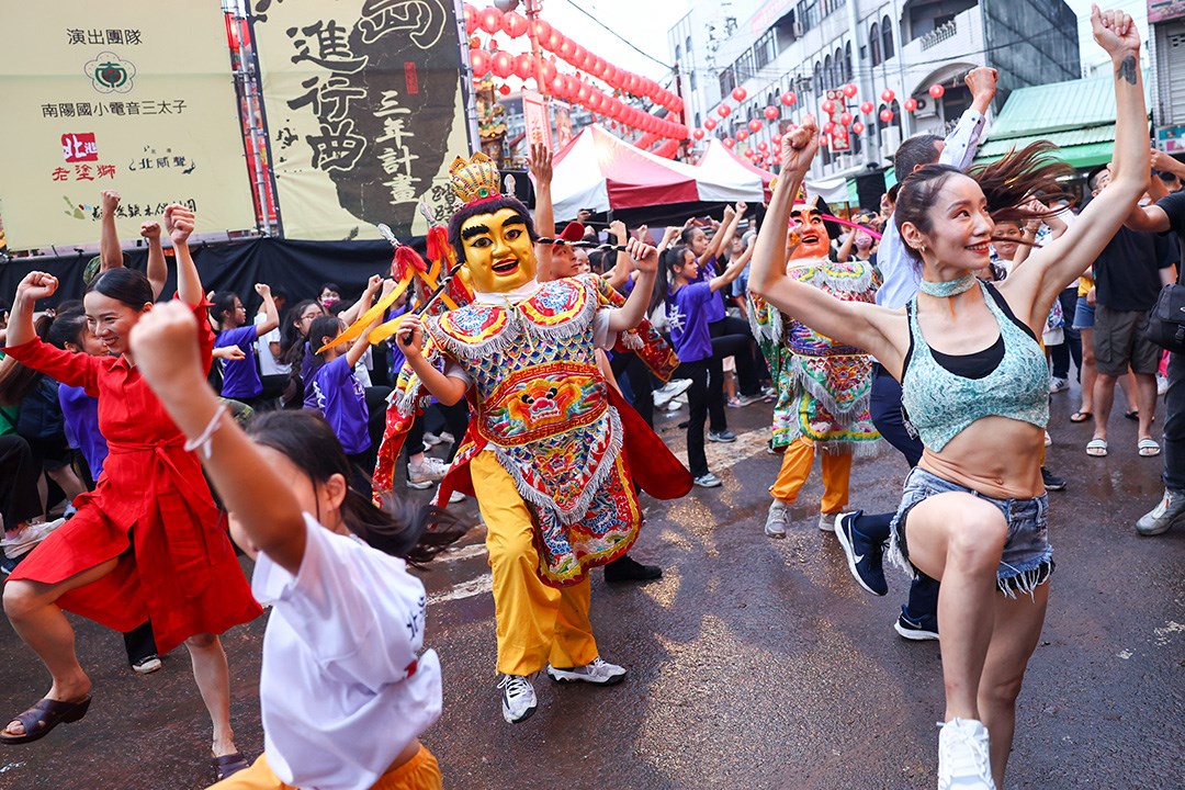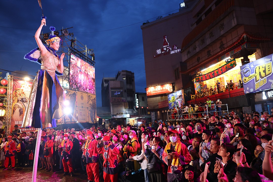 朝天宮的大廟口,加入了國家文藝獎得主何曉玫舞團帶來的《默島進行曲》,由北港在地傳承百年的老塗獅白鶴獅陣打頭陣、馬陣吹嗩吶開路;舞者扮演家將神祇、檳榔西施等辨識度高的台灣特殊文化符號,結合強烈的視覺裝置,站在三座傀儡高架裝置上跟藝陣交融,讓民眾幾乎目不轉睛。夜色一層一層暗了下來,舞者化身北港藝閣的一部分,與藝閣隊伍一起遊行,朝天宮的馬路依舊擠得水洩不通,表演藝術與民間信仰文化合作,共創了獨一無二的「默島進行曲在北港」。