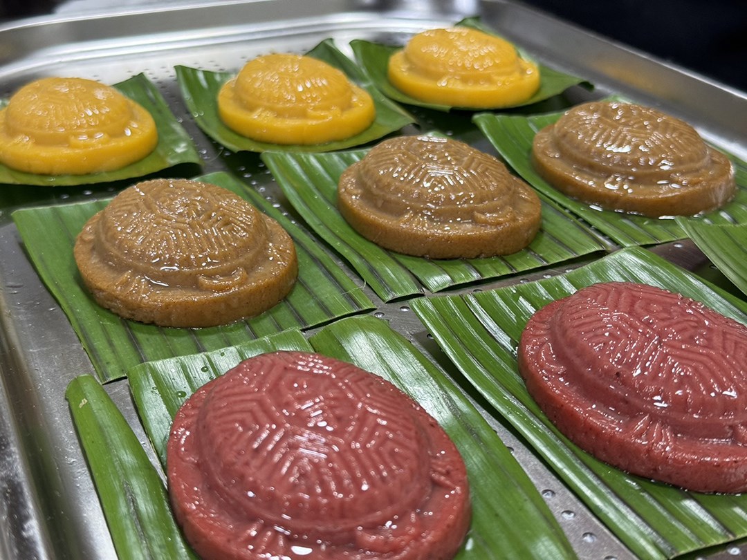 一個一個比手掌小的紅龜粿是店裡招牌,口味從花生到芝麻都有,搭配五顏六色的鮮豔粿皮,讓這道小吃不只夠味,也有看頭。其中,她將年輕人習慣配著咖啡吃的焦糖脆餅,當作紅龜粿餡料,口感酥脆相當獨特,讓這個傳統小吃不再限於古早味,而是東西方合併的美食產物。