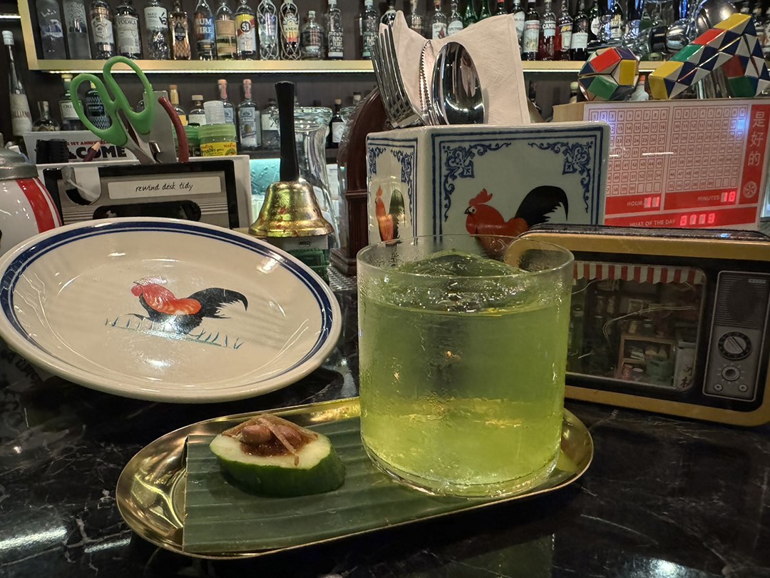 吸引記者目光的是一杯淡綠色調酒,主打椰漿飯口味,一旁搭配黃瓜切片和花生魚乾,用創新方式品嚐東南亞的傳統風味。Sebastian表示,新加坡這幾年變化許多,傳統的雜貨店逐漸褪色、現代風格的美食則越來越多,「其實,復古也應該是一種軟實力」。