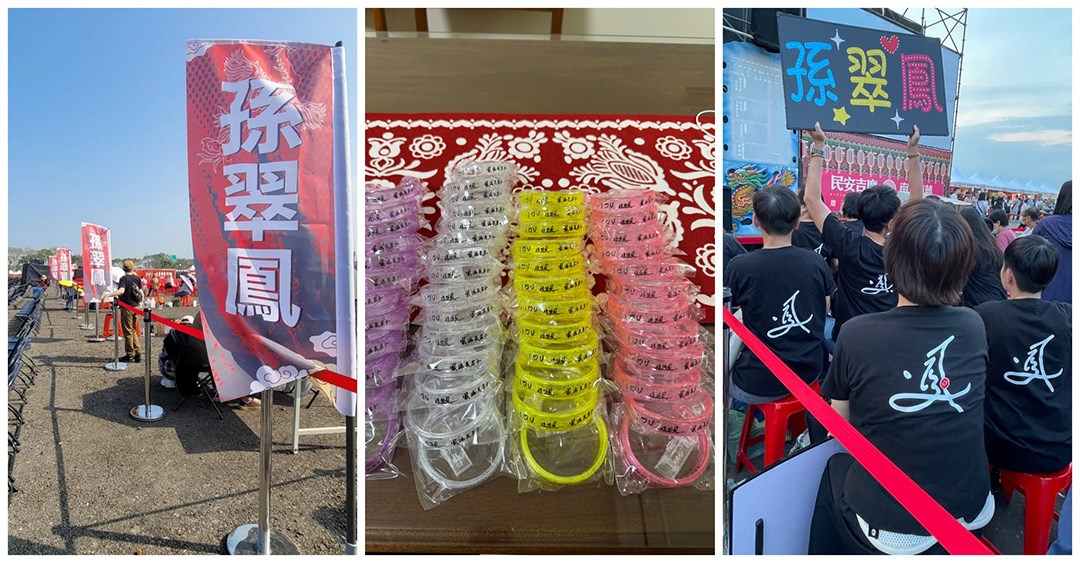 當你以為歌仔戲的戲迷應援偶像方式只有尖叫、掌聲和快門聲嗎?遠遠不止,從孫翠鳳名字的關東旗、燈牌,團服到印有她俊俏扮相的旗幟,親筆字樣的發光手環,各個齊全,全套排開氣勢十足。