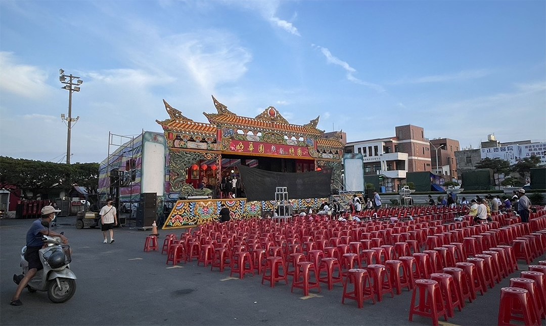 康芮颱風過境後的週五,距離台南廟宇晚上7點的演出還有6、7個小時,已有人頂著烈日到場,在戲台前的紅色塑膠椅上安頓好工具,佔好位置。