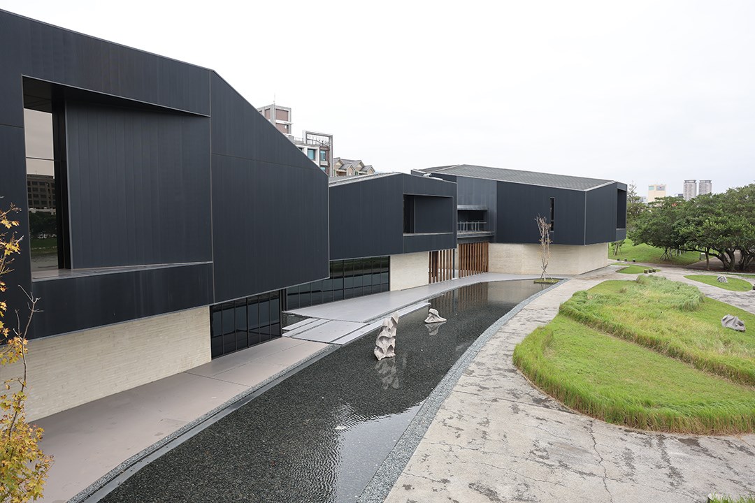眼前建築群是桃園橫山書法藝術館(下稱書藝館)。鄰近桃園機場,周圍建物均有高度限制,意外讓書藝館擁有開闊視野,加上位置原是灌溉用埤塘,建築師遂利用現有埤塘景觀比為墨池,以公園基地比為硯台,打造如五方篆印的建築群相呼應,讓書藝館自2021年營運以來,就以別致美景成為社群打卡聖地。