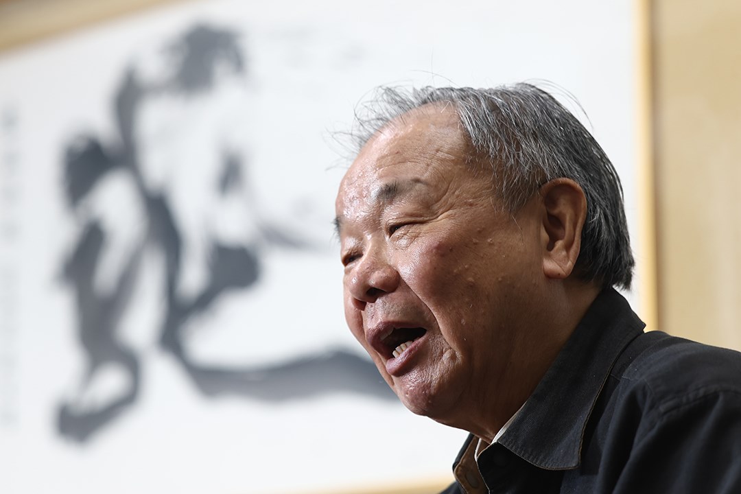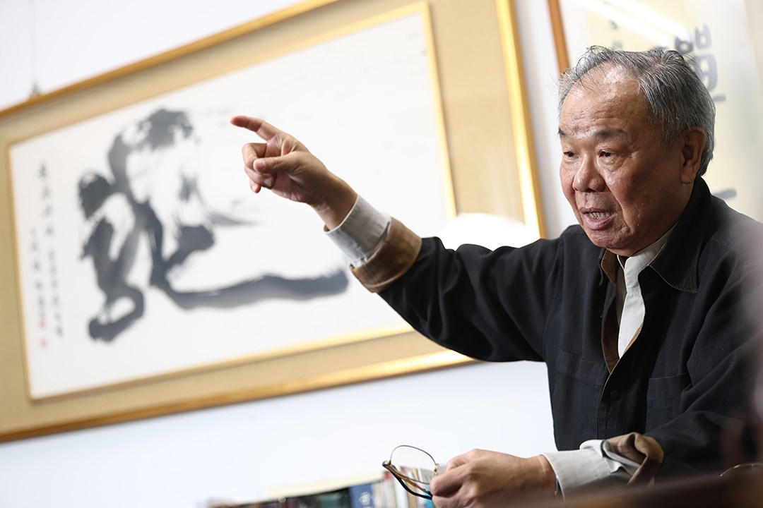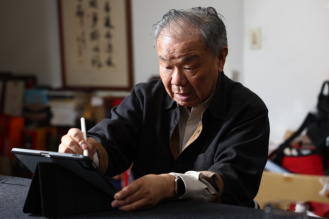 76歲書法家張炳煌低著頭,平板電腦白光映得他臉發亮,面前是張寬如雙人床的大桌,各式尺寸宣紙、書法研究專書簇擁著桌面,遠些還有一整面毛筆牆。終於打開「e筆」App,他興奮繞過那廣闊的桌,急急地要來示範究竟如何用平板寫書法。