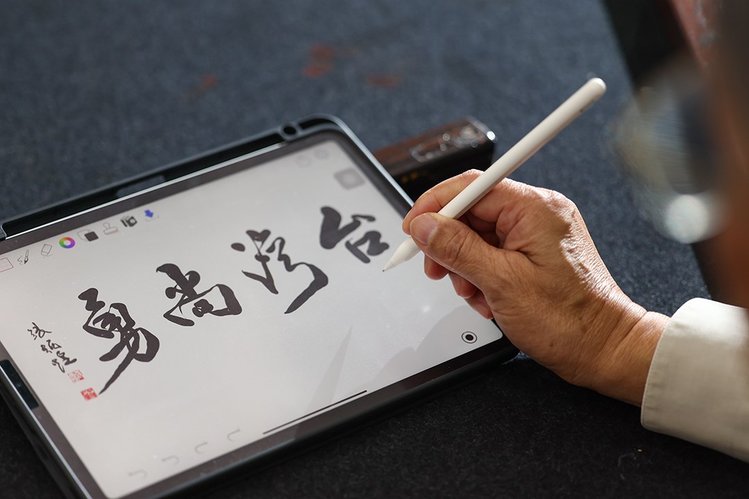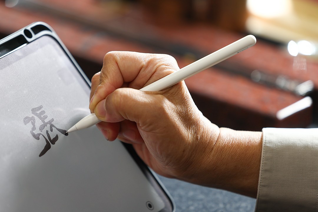 就算不是數位原生世代,被年逾古稀的老人家教導使用平板,終歸是種新奇體驗。張炳煌精神抖擻,選好程式內筆跡粗細濃淡,拿著Apple pencil的手懸在空中,期待的呵呵笑:「快點快點,啊我們要來寫什麼?」