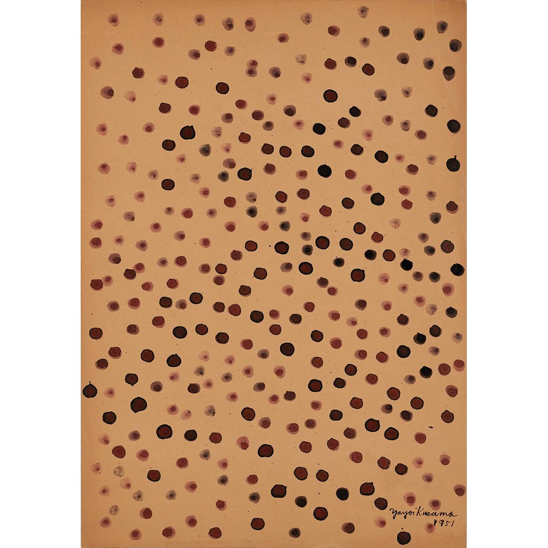 展中最早作品是1951年創作、相當能代表她今日創作風格的畫作「點」。有關圓點風格,草間彌生曾多次向外界提及精神疾病促成其標誌性圓點,而這幅1951年的畫作「點」創作值草間彌生就讀美術工藝學校期間,是她赴美發展前少數留下的早期圓點系列創作。