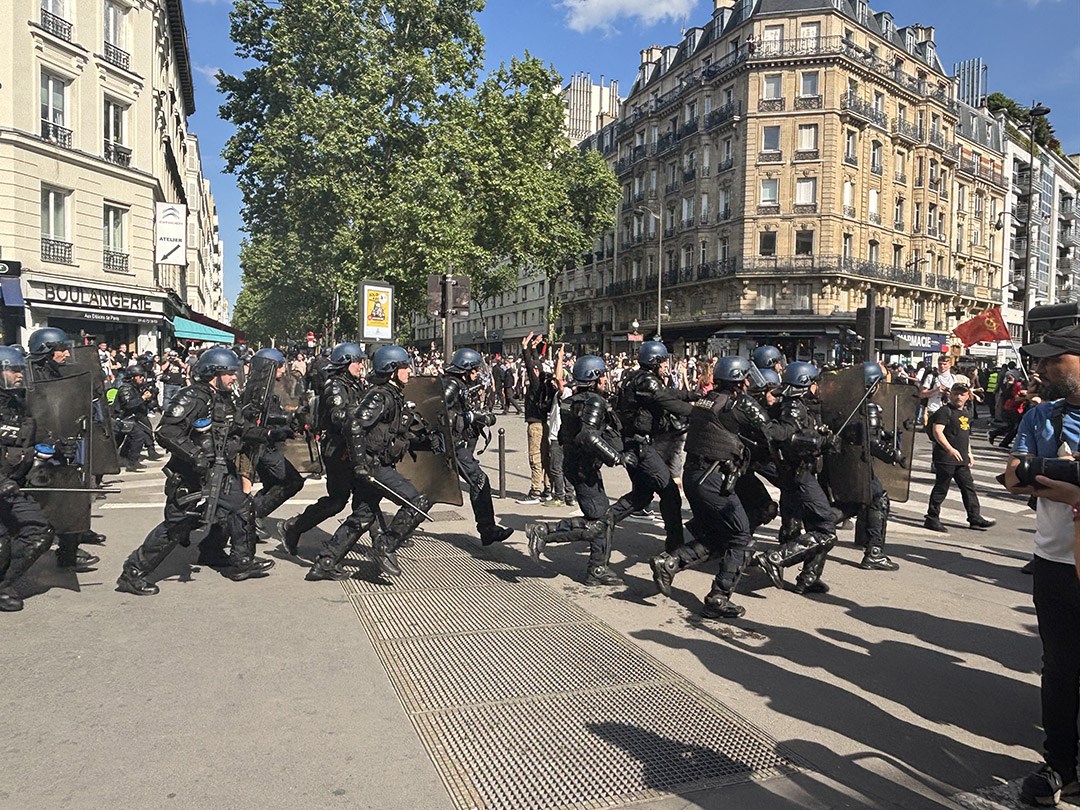 之前我目睹過路邊被黃背心示威者點燃的重機,黑煙刺鼻,爆炸聲讓人心驚。勞動節巴黎遊行這天,我看見全身黑衣黑褲、黑布掩蓋口鼻的「黑塊」(Black blocs),拿工具砸向公車站玻璃,還強硬地禁止任何人拍攝,否則一群人會將你團團圍住,開始搶你手中相機。