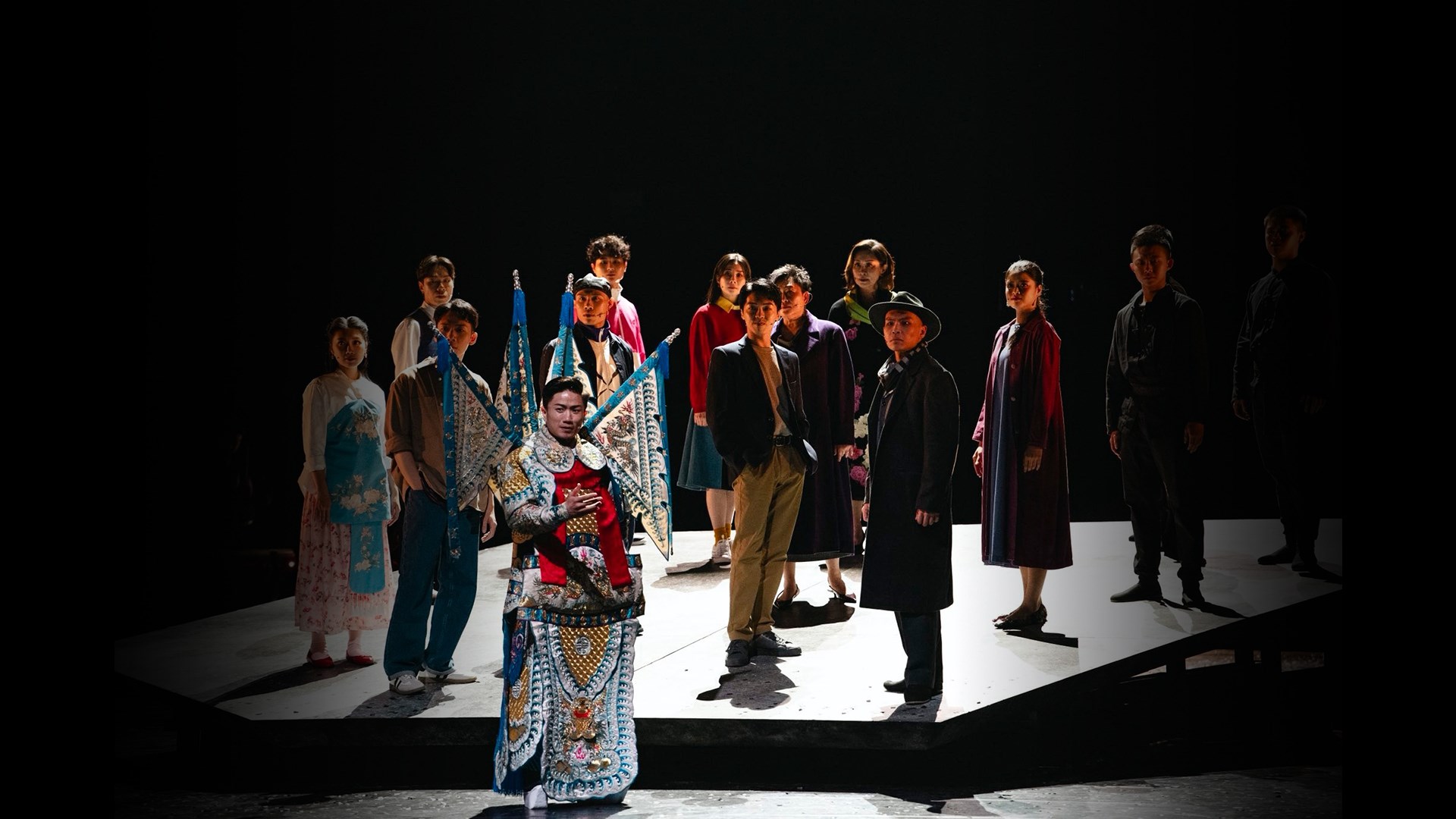 序幕揭開,京劇裡的一桌二椅從空中垂吊、浮在不平之地(傾斜式的舞台)上方,象徵性十足,這項曾被視為國粹、人類文明遺產的曾經輝煌,來到21世紀已成為強弩之末。戲從一開始就透過一群演員報幕式的告訴觀眾,有一個出色的、剛拿到大獎的京劇演員,不告而別,離開自小長大的劇團,沒人知道他去了哪裡。